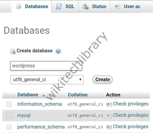 You will also view a login on the web browser of PhyMyAdmin. ‘root’ is the default username. Leave the field of password blank and click on the Go button. Next, press the top option of databases. Enter the name of your website database, then press the Create button under Create database page.