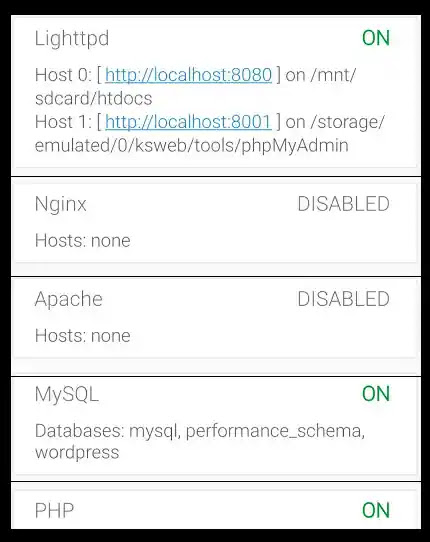 We can use the Lighttpd server for free in this application to install WordPress. Make sure Lighttpd, MySQL, and PHP are active in the Status tab. You can also go to the appropriate tab of the server and confirm if the button Enable is activated.
