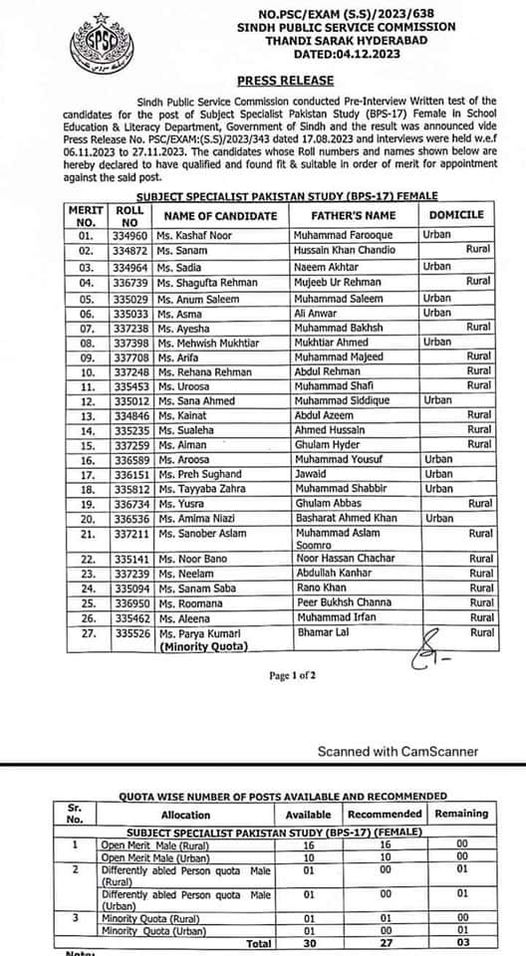 Sindh Public Service Commission (SPSC) has announced the merit list for recruitment for the post of Subject Specialist Pak Study female in the School Education & Literacy Department. The recruitment was done through a competitive process involving written exams and interviews.